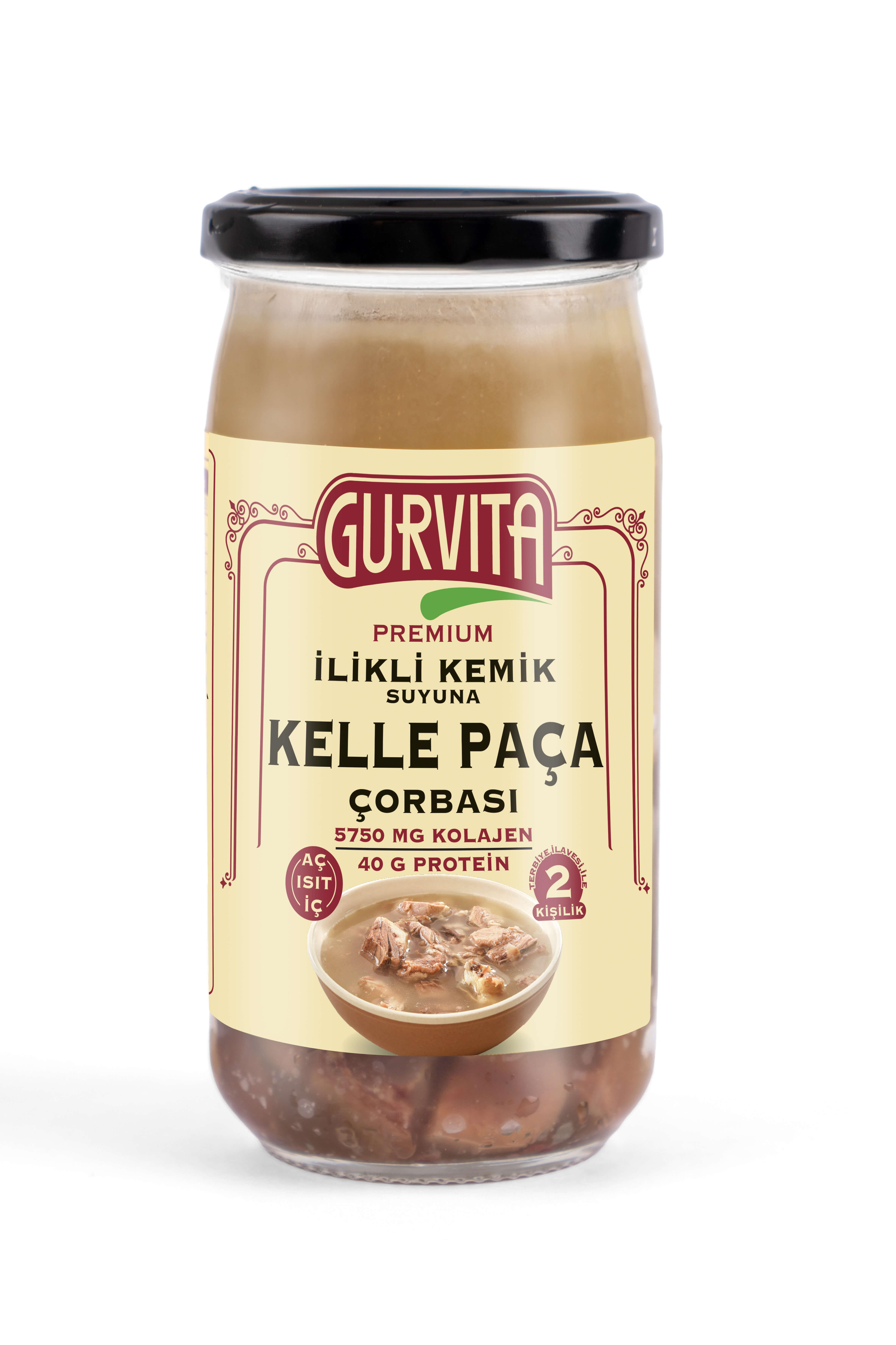 Mutfağımızın ve gurmelerin vazgeçilmezi klasik kuzu kelle paça çorbamızı, kolajen deposu, ayak paça ve Gurvita ilikli kemik sularımızla yeniden yorumladık. Kuzu kelle, dana ayak paça, dana dil ve dana yanağın zengin birlikteliği ile ustalık yöntemiyle bol bol etli haliyle kemik suyuna pişirdik. Artizanal olarak hazırladığımız bu özel lezzetli çorbayı sadece ısıtarak tüketebileceğiniz gibi, arzu ederseniz terbiyeli de yapabilirsiniz…